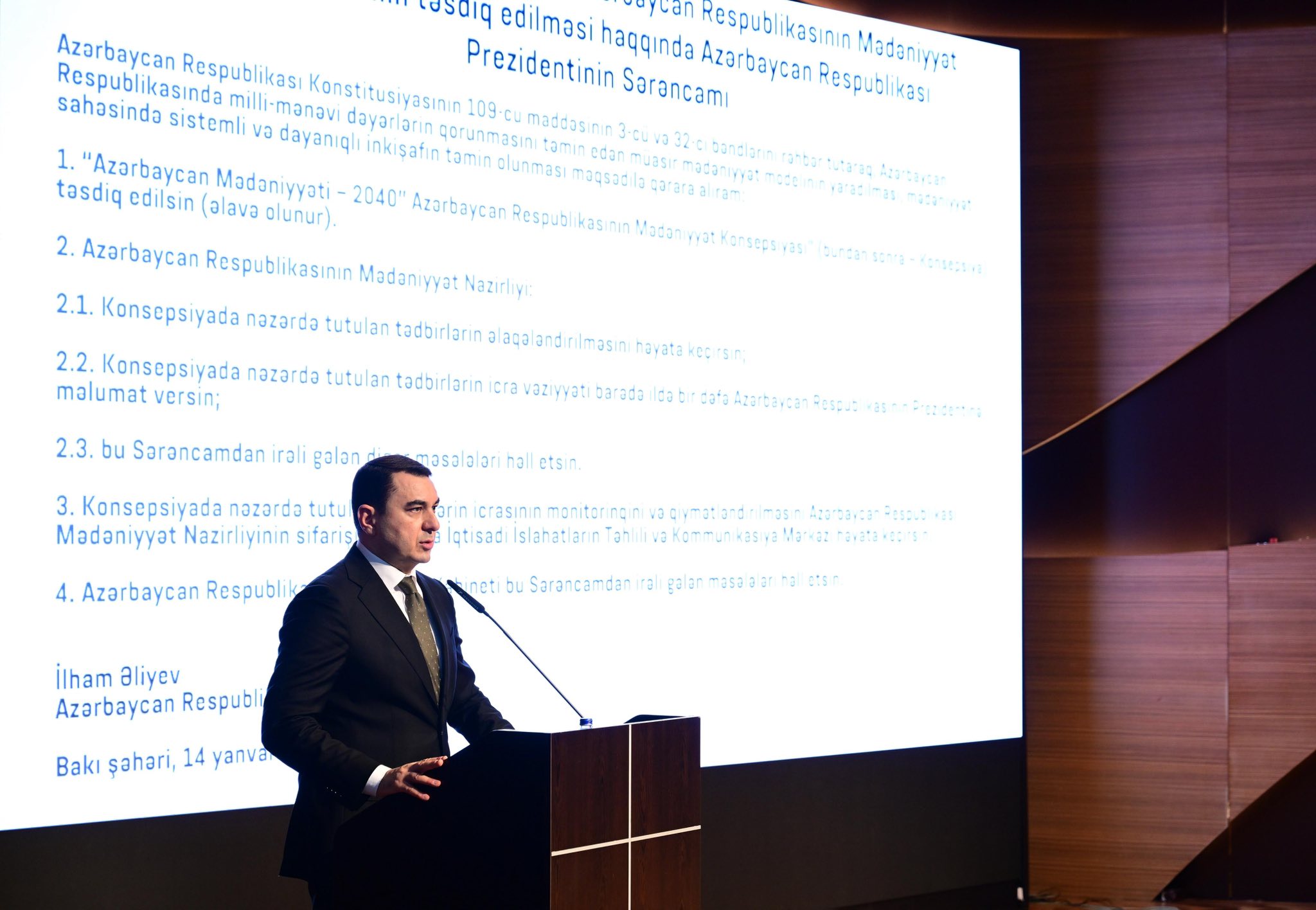 Tədbirdə mədəniyyət naziri Adil Kərimli çıxış edərək Mədəniyyət Konsepsiyasının məqsədləri və qarşıda duran vəzifələr barədə qısa məlumat verib.