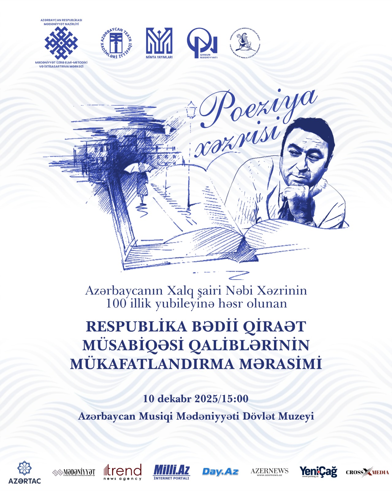 Dekabrın 10-da Azərbaycan Musiqi Mədəniyyəti Dövlət Muzeyində (Muzey Mərkəzi) “Poeziya Xəzrisi” Respublika bədii qiraət müsabiqəsi qaliblərinin mükafatlandırma mərasimi keçiriləcək.