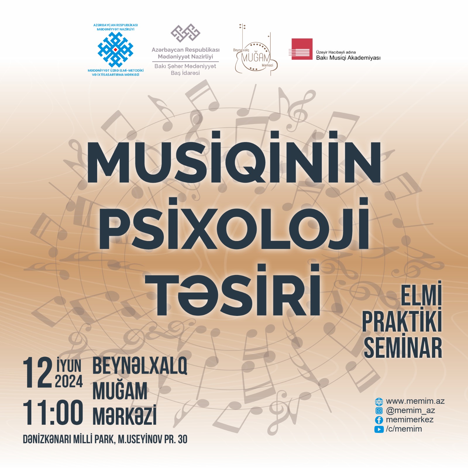 Azərbaycan Respublikası Mədəniyyət Nazirliyi Mədəniyyət üzrə Elmi-Metodiki və İxtisasartırma Mərkəzinin təşkilatçılığı, Bakı Şəhər Mədəniyyət Baş İdarəsi və Beynəlxalq Muğam Mərkəzinin dəstəyi ilə 12 İyun, 2024-cü il tarixində “Musiqinin psixoloji təsiri” mövzusunda elmi-praktiki seminar keçiriləcək.