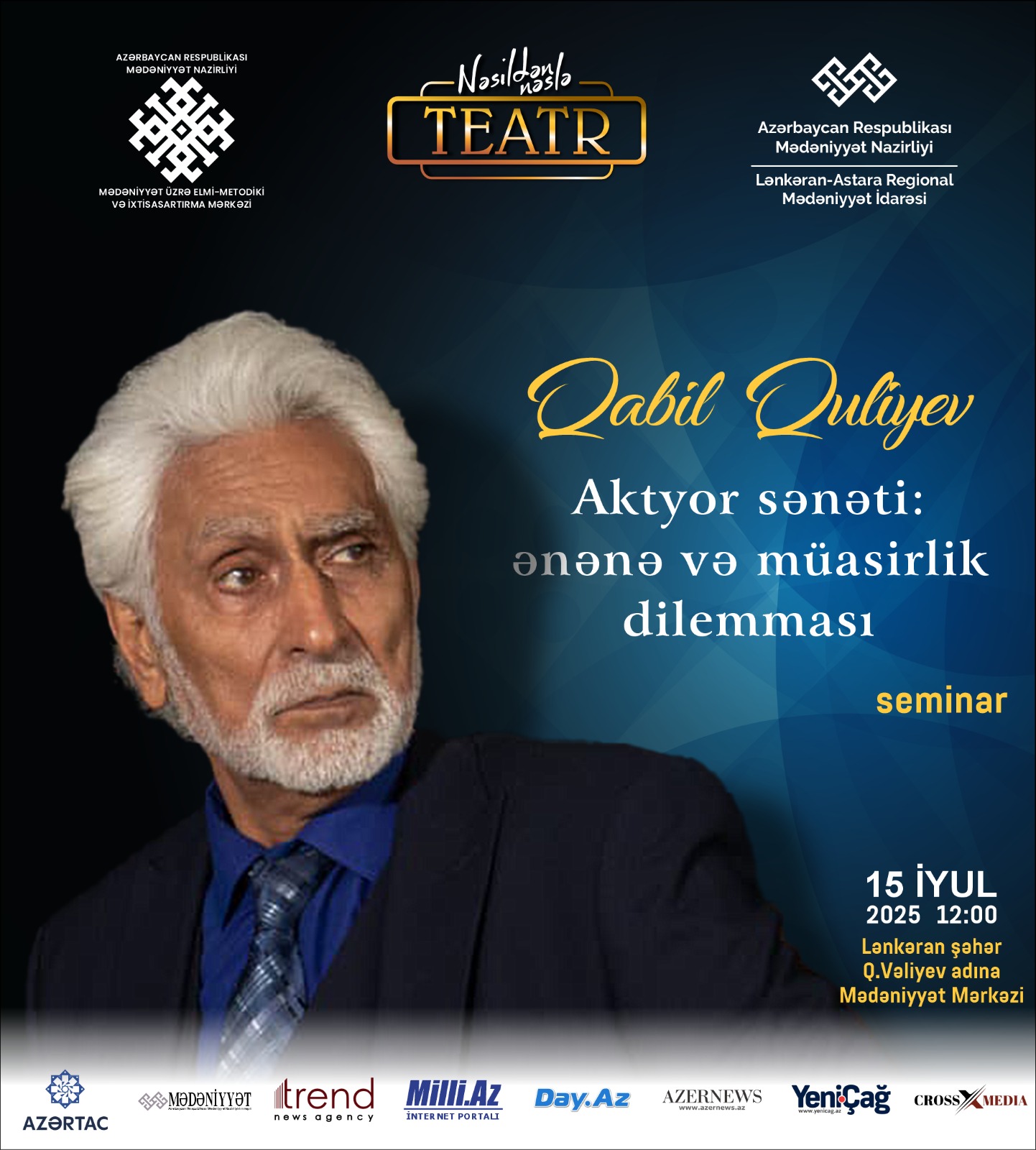 Azərbaycan Respublikası Mədəniyyət Nazirliyinin Mədəniyyət üzrə Elmi-Metodiki və İxtisasartırma Mərkəzinin “Nəsildən nəslə teatr” layihəsinin növbəti seminarı 2025-ci il 15 iyul tarixində Lənkəran-Astara Regional Mədəniyyət İdarəsinin dəstəyi ilə Lənkəran şəhər Q.Vəliyev adına Mədəniyyət Mərkəzində keçiriləcək.