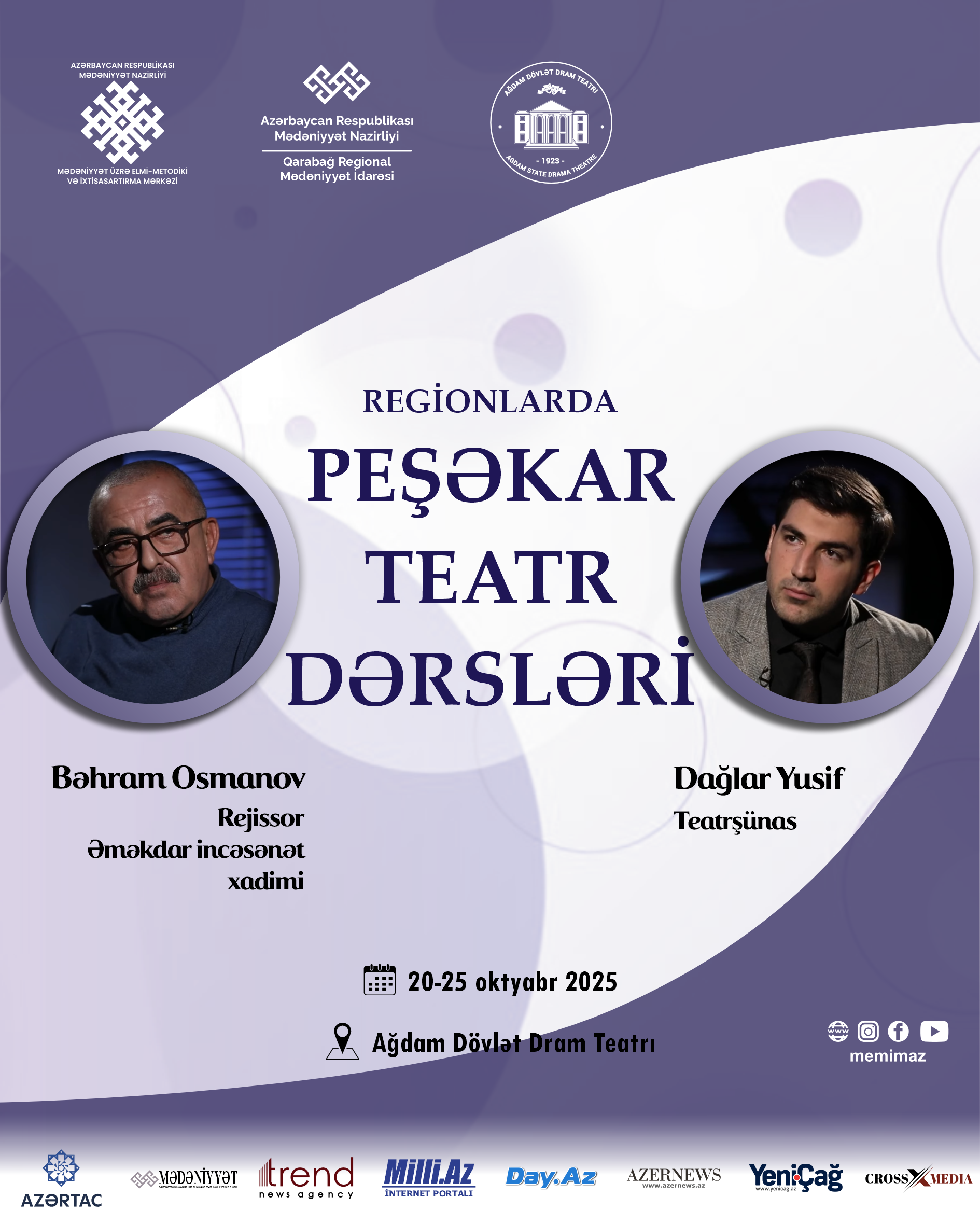 20-25 oktyabr tarixlərində Ağdam Dövlət Dram Teatrında, 26-31 oktyabr tarixlərində isə Füzuli Dövlət Dram Teatrında “Regionlarda peşəkar teatr dərsləri” adlı silsilə tədbirlər keçiriləcək.