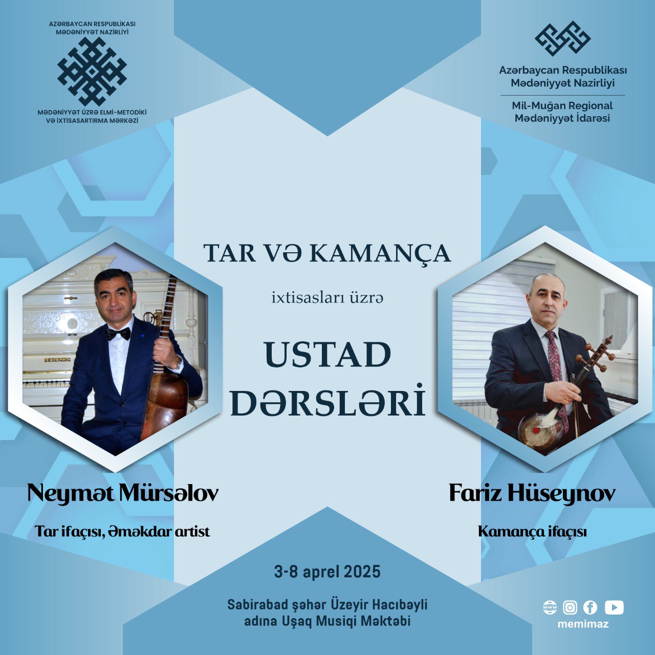 Mədəniyyət Nazirliyinin Mədəniyyət üzrə Elmi-Metodiki və İxtisasartırma Mərkəzi Mil-Muğan Regional Mədəniyyət İdarəsinin dəstəyi ilə 2025-ci il 3-8 aprel tarixlərində Sabirabad şəhərində regionda fəaliyyət göstərən uşaq musiqi və incəsənət məktəblərinin kollektivləri üçün tar və kamança ixtisasları üzrə ustad dərsləri təşkil edəcək.