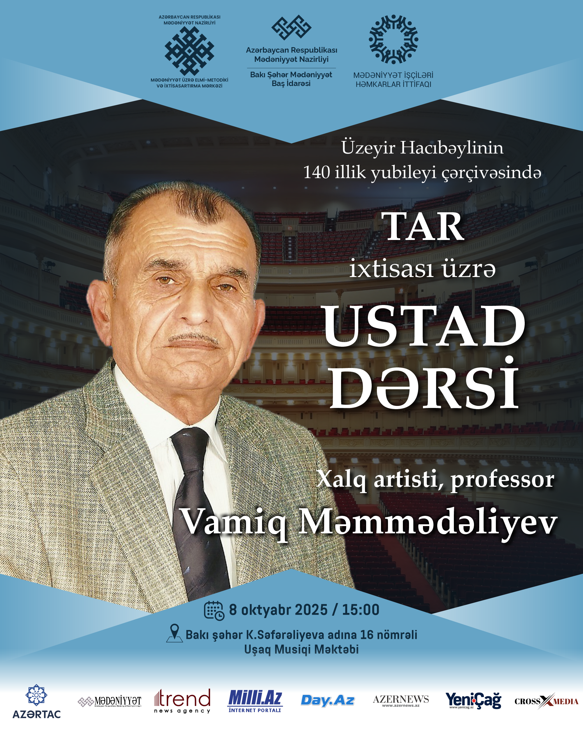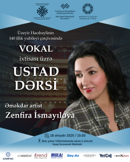 Mədəniyyət Nazirliyinin Mədəniyyət üzrə Elmi-Metodiki və İxtisasartırma Mərkəzinin təşkilatçılığı, Azərbaycan Həmkarlar İttifaqları Konfederasiyasının üzv təşkilatı – Mədəniyyət İşçiləri Həmkarlar İttifaqı, Bakı Şəhər Mədəniyyət Baş İdarəsi və Abşeron-Xızı Regional Mədəniyyət İdarəsinin dəstəyi ilə 8–18 oktyabr tarixlərində bu idarələrin tabeliyində fəaliyyət göstərən musiqi və incəsənət məktəblərinin müəllim və şagirdləri üçün ustad dərsləri keçiriləcək.