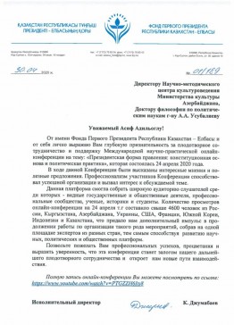 Qazaxıstanın Birinci Prezidenti Fondunun icraçı direktorunun imzası ilə Mərkəzimizin direktoruna ünvanlanmış təşəkkür məktubu
