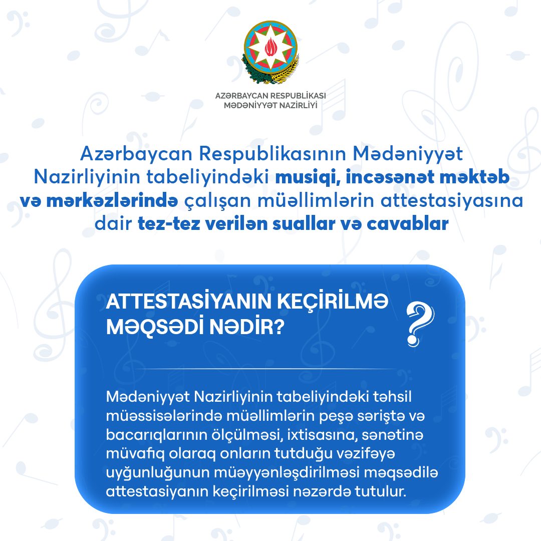 Azərbaycan Respublikası Mədəniyyət Nazirliyinin tabeliyində fəaliyyət göstərən musiqi, incəsənət məktəb və mərkəzlərində çalışan müəllimlərin peşə səriştə və bacarıqlarının ölçülməsi, ixtisasına, sənətinə müvafiq olaraq onların tutduğu vəzifəyə uyğunluğunun müəyyənləşdirilməsi məqsədilə attestasiya həyata keçirilir.