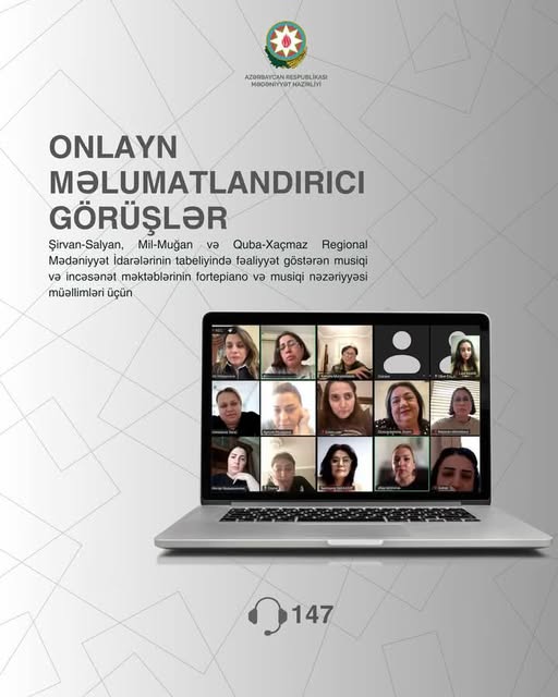 17 aprel 2025-ci il tarixindən etibarən Azərbaycan Respublikası Mədəniyyət Nazirliyinin Mədəniyyət üzrə Elmi-Metodiki və İxtisasartırma Mərkəzinin təşkilatçılığı ilə Şirvan-Salyan, Mil-Muğan və Quba-Xaçmaz Regional Mədəniyyət İdarələrinin tabeliyində fəaliyyət göstərən musiqi və incəsənət məktəblərinin fortepiano və musiqi nəzəriyyəsi ixtisasları üzrə təhsilverənləri üçün attestasiya proqramının daha geniş izah edilməsi və aktual sualların cavablandırılması məqsədilə onlayn qaydada məlumatlandırıcı görüşlər keçirilir.