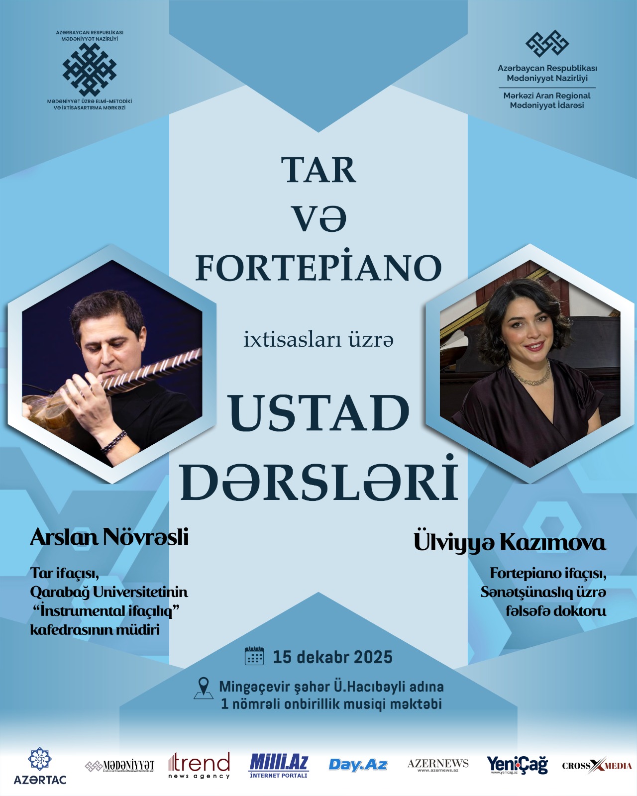 Dekabrın 15-də Mingəçevir şəhər Üzeyir Hacıbəyli adına 1 nömrəli onbirillik musiqi məktəbində keçiriləcək tar ixtisası üzrə ustad dərsi Qarabağ Universiteti İncəsənət fakültəsinin İnstrumental ifaçılıq kafedrasının müdiri Arslan Növrəsli, fortepiano ixtisası üzrə ustad dərsi isə Azərbaycan Milli Konservatoriyası (AMK) nəzdində Musiqi Kollecinin Fortepiano şöbəsinin fənn birləşmə komissiyasının sədri sənətşünaslıq üzrə fəlsəfə doktoru Ülviyyə Kazımova tərəfindən aparılacaq.