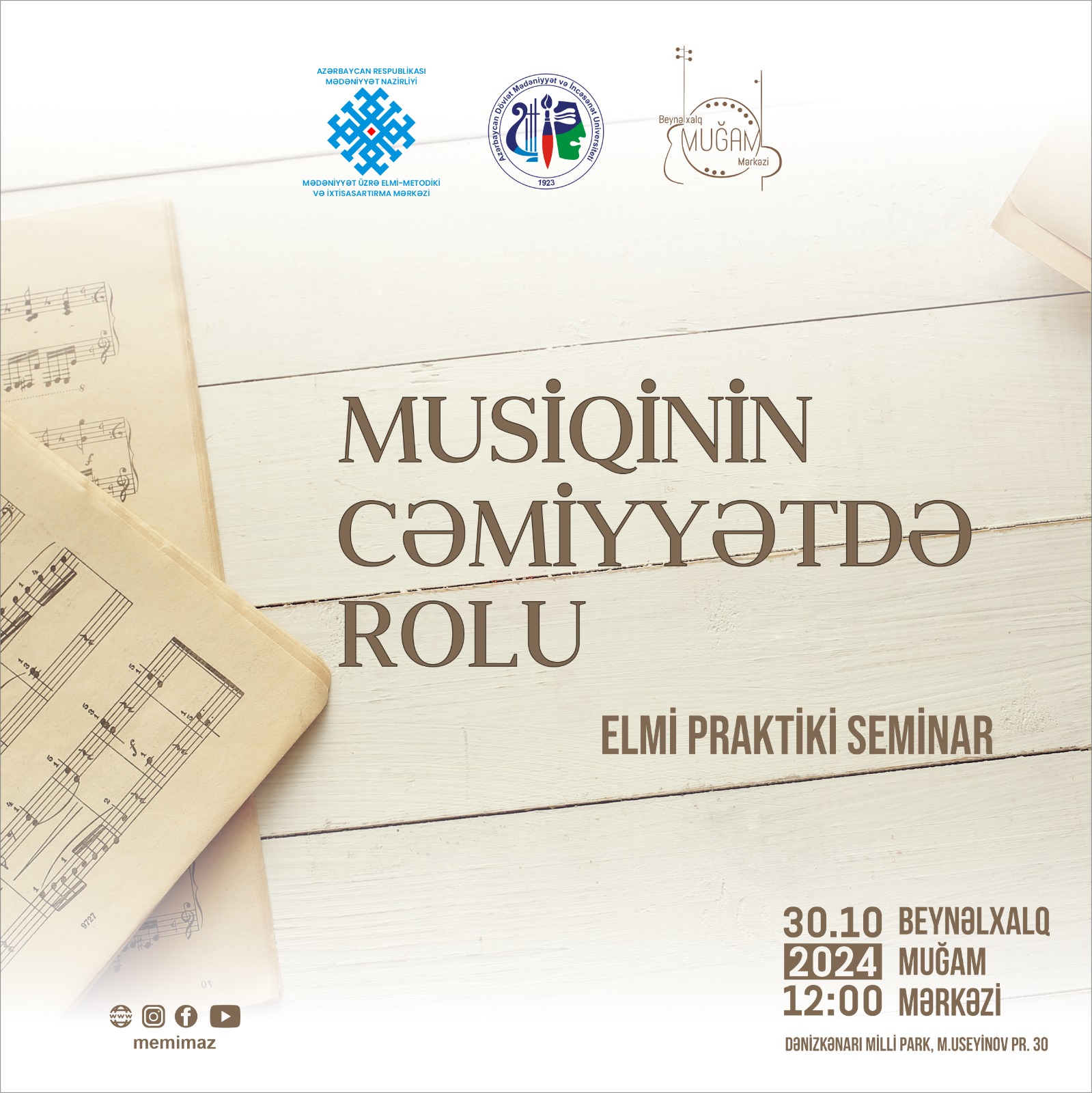 Azərbaycan Respublikası Mədəniyyət Nazirliyinin Mədəniyyət üzrə Elmi-Metodiki və İxtisasartırma Mərkəzinin təşkilatçılığı, Azərbaycan Dövlət Mədəniyyət və İncəsənət Universitetinin və Beynəlxalq Muğam Mərkəzinin dəstəyi ilə 30 oktyabr 2024-cü il tarixində “Musiqinin cəmiyyətdə rolu” mövzusunda elmi-praktiki seminar keçiriləcək.