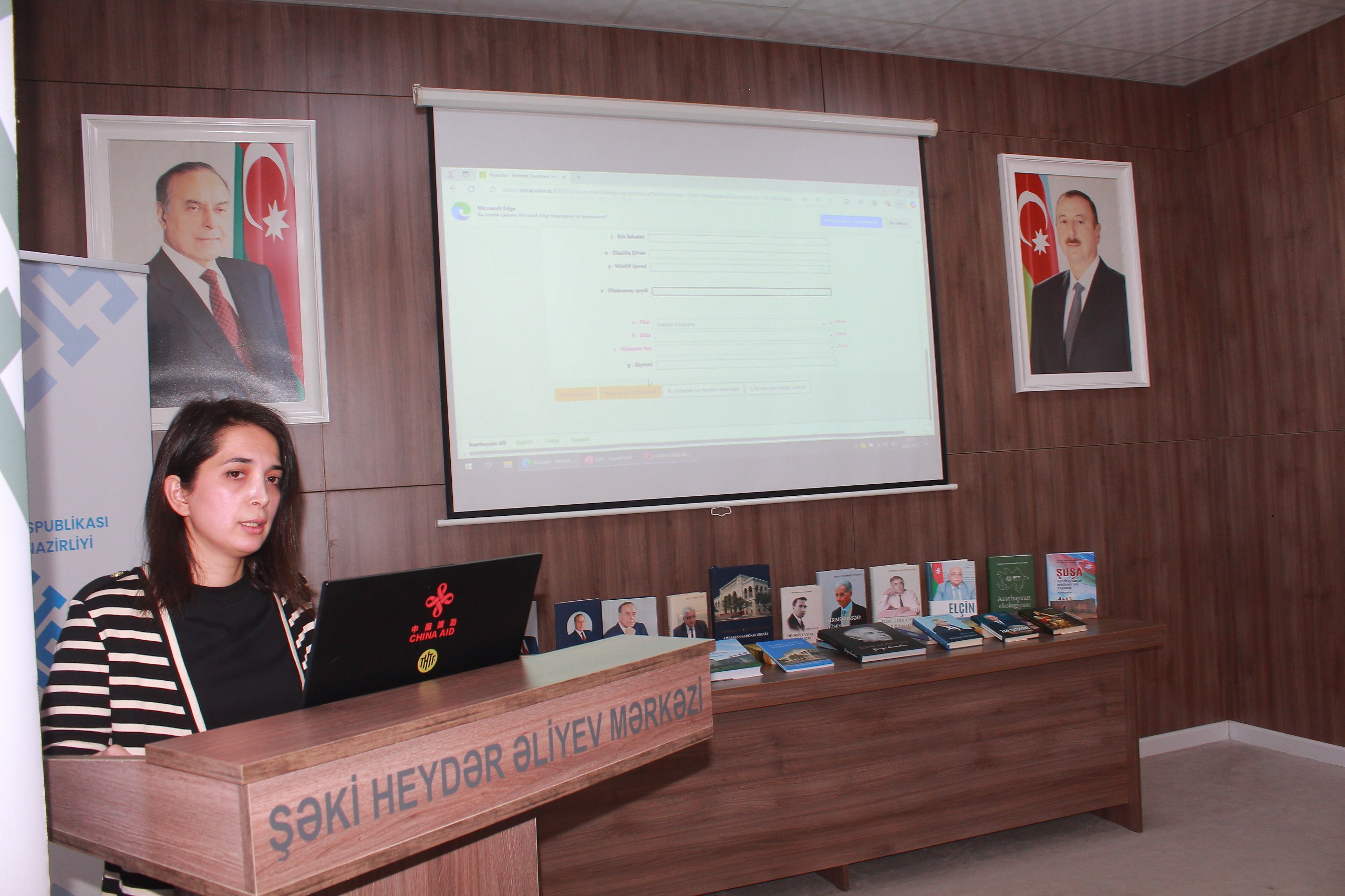 Daha sonra Azərbaycan Milli Kitabxanasının direktor müavini, Tarix üzrə fəlsəfə doktoru Ədibə İsmayılova və Milli Kitabxananın şöbə müdiri Sevinc Əfəndiyeva “Müasir kitabxanalarda elektron – informasiya xidmətinin təşkili” və “KOHA Avtomatlaşdırılmış Kitabxana İdarəetmə Sisteminin kitabxanalarda tətbiqi” mövzularında məruzə və təqdimatla çıxış ediblər. Təlimdə Şəki ilə yanaşı Qəbələ, Oğuz, Qax, Zaqatala və Balakəndən olan kitabxana əməkdaşları iştirak ediblər.
