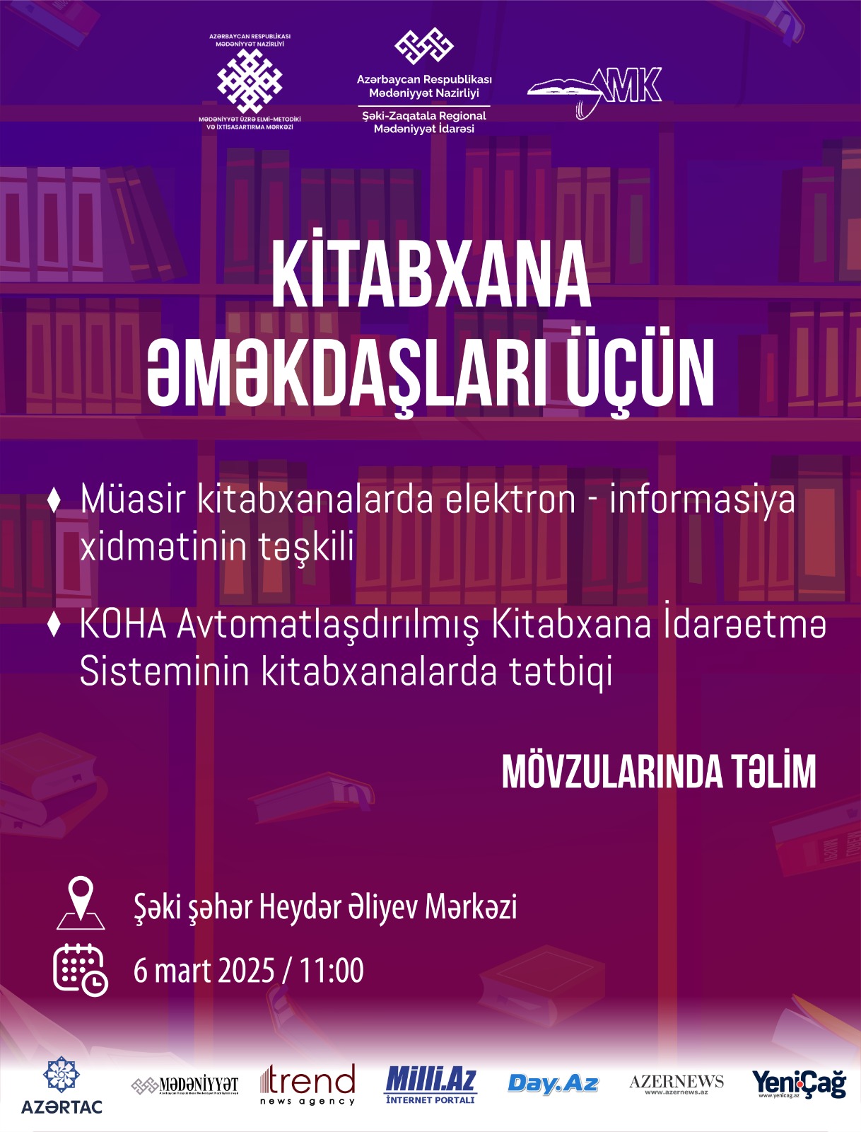 Mədəniyyət Nazirliyinin Mədəniyyət üzrə Elmi-Metodiki və İxtisasartırma Mərkəzinin təşkilatçılığı, Azərbaycan Milli Kitabxanasının tərəfdaşlığı, Şəki-Zaqatala Regional Mədəniyyət İdarəsinin dəstəyi ilə Şəki şəhəri və ətraf rayonlarda yerləşən kitabxanaların əməkdaşları üçün təlimə start veriləcək.