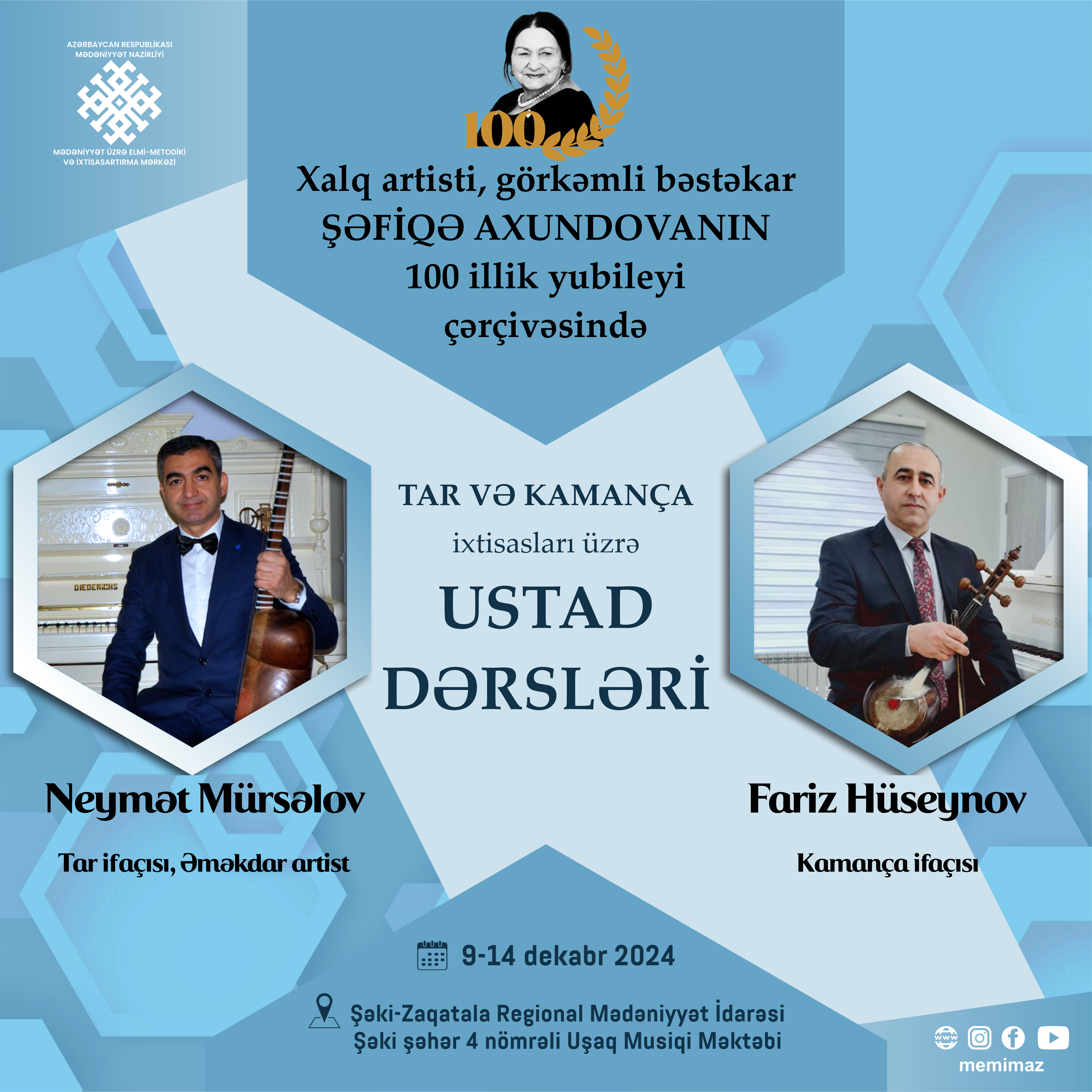 9-14 dekabr tarixlərində Şəki şəhərinin 4 №-li uşaq musiqi məktəbində baş tutacaq ustad dərsləri tar ifaçısı, Əməkdar artist Neymət Mürsəlov və kamança ifaçısı Fariz Hüseynov tərəfindən keçiriləcəkdir.