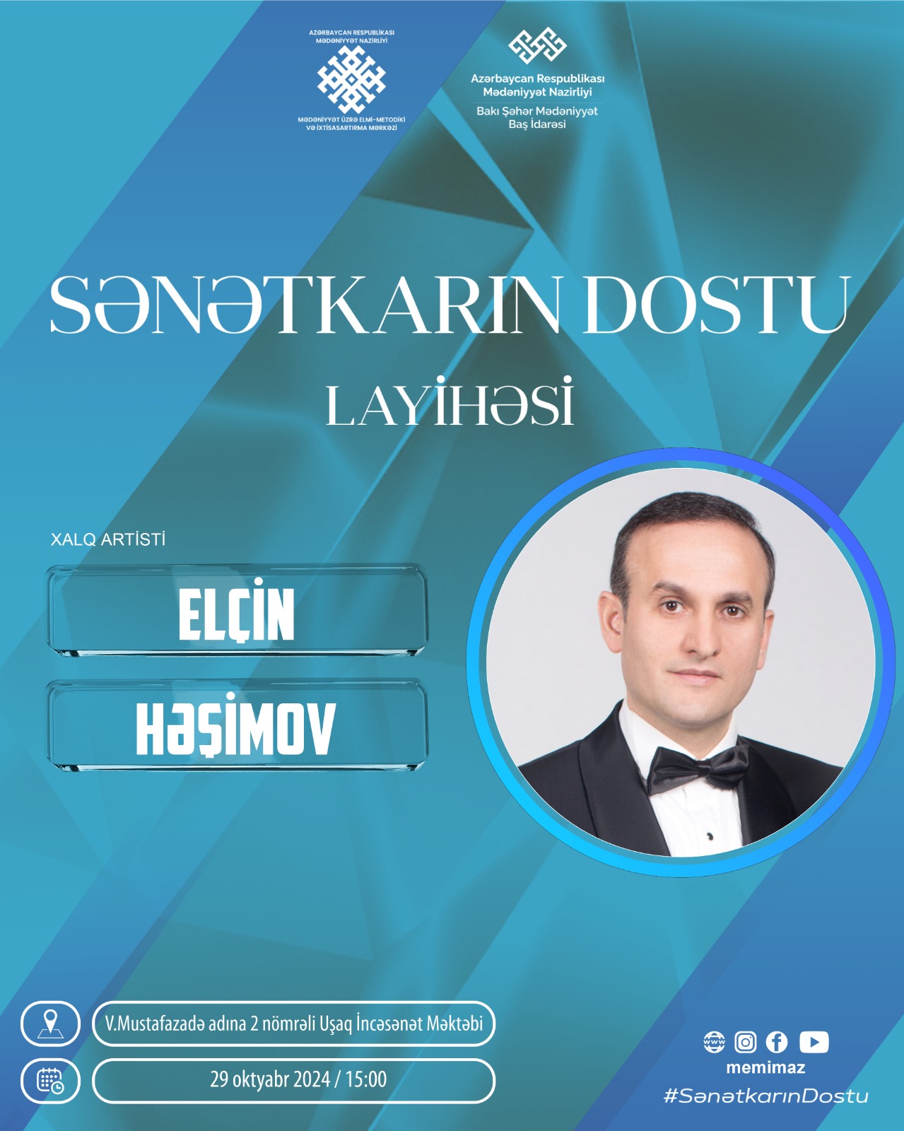 29 oktyabr 2024-cü il tarixində Azərbaycan Respublikası Mədəniyyət Nazirliyinin Mədəniyyət üzrə Elmi-Metodiki və İxtisasartırma Mərkəzinin təşkilatçılığı, Bakı şəhər Mədəniyyət Baş İdarəsinin dəstəyi ilə “Sənətkarın dostu” layihəsi çərçivəsində Azərbaycan Respublikasının Xalq artisti, tarzən Elçin Həşimov ilə görüş keçiriləcək.