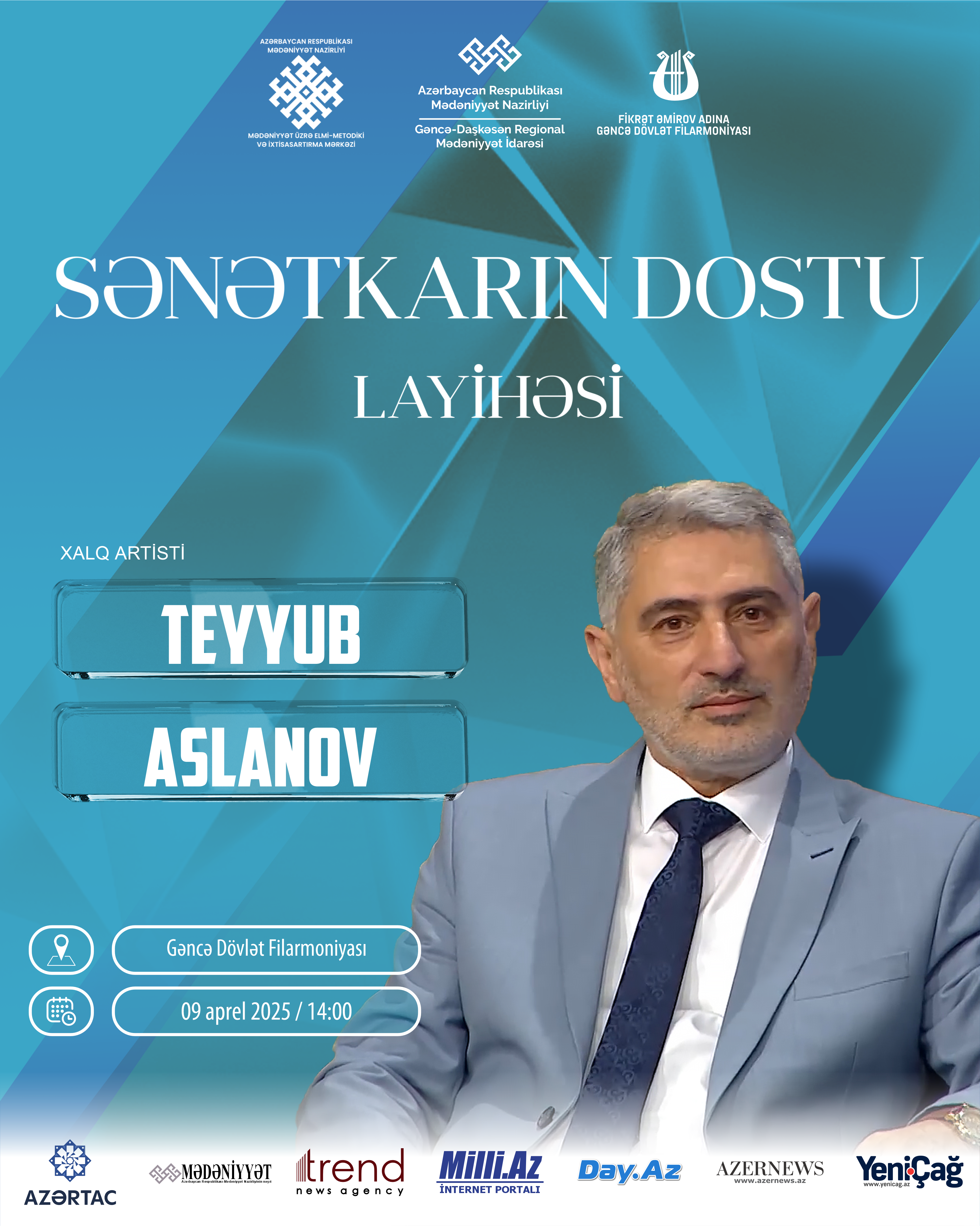 Azərbaycan Respublikası Mədəniyyət Nazirliyinin Mədəniyyət üzrə Elmi-Metodiki və İxtisasartırma Mərkəzinin təşkilatçılığı, Gəncə-Daşkəsən Regional Mədəniyyət İdarəsi və Fikrət Əmirov adına Gəncə Dövlət Filarmoniyasının dəstəyi ilə 9 aprel tarixində “Sənətkarın dostu” layihəsi çərçivəsində növbəti görüş Azərbaycan Respublikasının Xalq artisti, xanəndə Teyyub Aslanovun iştirakı ilə gerçəkləşəcək.